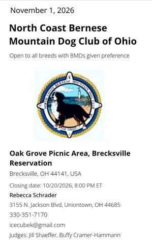 Our parent club, the Bernese Mountain Dog Club of America, lists upcoming events taking place throught the Nation. If you just happen to be close by any one of these events and you want to mingle with other Berners and their people, this listing might come in handy!Type your paragraph here.