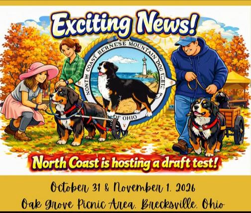 We are thankful to the Bernese Mountain Dog Club of America for their help, as well as to Cinthia Lee from the Heart of Michigan Club, Tim Thompson from the Buckeye Club, Julie Bacon (The Q Coach and Wainwright Cart Co. [formerly Wilczeck]), and Susan VanOcker from the Bernese Mountain Dog Club of Watchung. It is no small thing to take on the task of creating a drafting event. You are all appreciated. Inquire at northcoastdraft@gmail.com