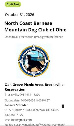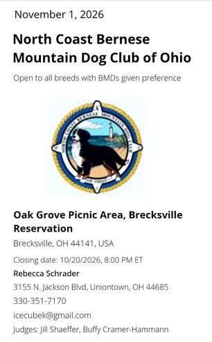We are thankful to the Bernese Mountain Dog Club of America for their help, as well as to Cinthia Lee from the Heart of Michigan Club, Tim Thompson from the Buckeye Club, Julie Bacon (The Q Coach and Wainwright Cart Co. [formerly Wilczeck]), and Susan VanOcker from the Bernese Mountain Dog Club of Watchung. It is no small thing to take on the task of creating a drafting event. You are all appreciated. Inquire at northcoastdraft@gmail.com