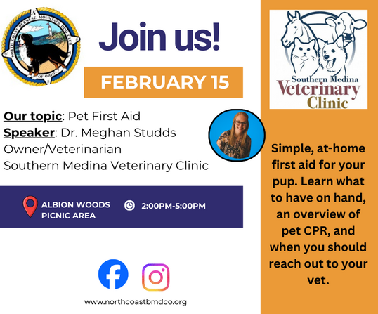 ***Sunday, February 15, 2026, 2 - 5PM: We will be meeting at the Albion Woods Picnic Area in Strongsville, Ohio. We are looking forward to meet Dr. Meghan Studds and her detailed symposium on canine First Aid and CPR. She is affiliated with the Southern Medina Veterinary Clinic